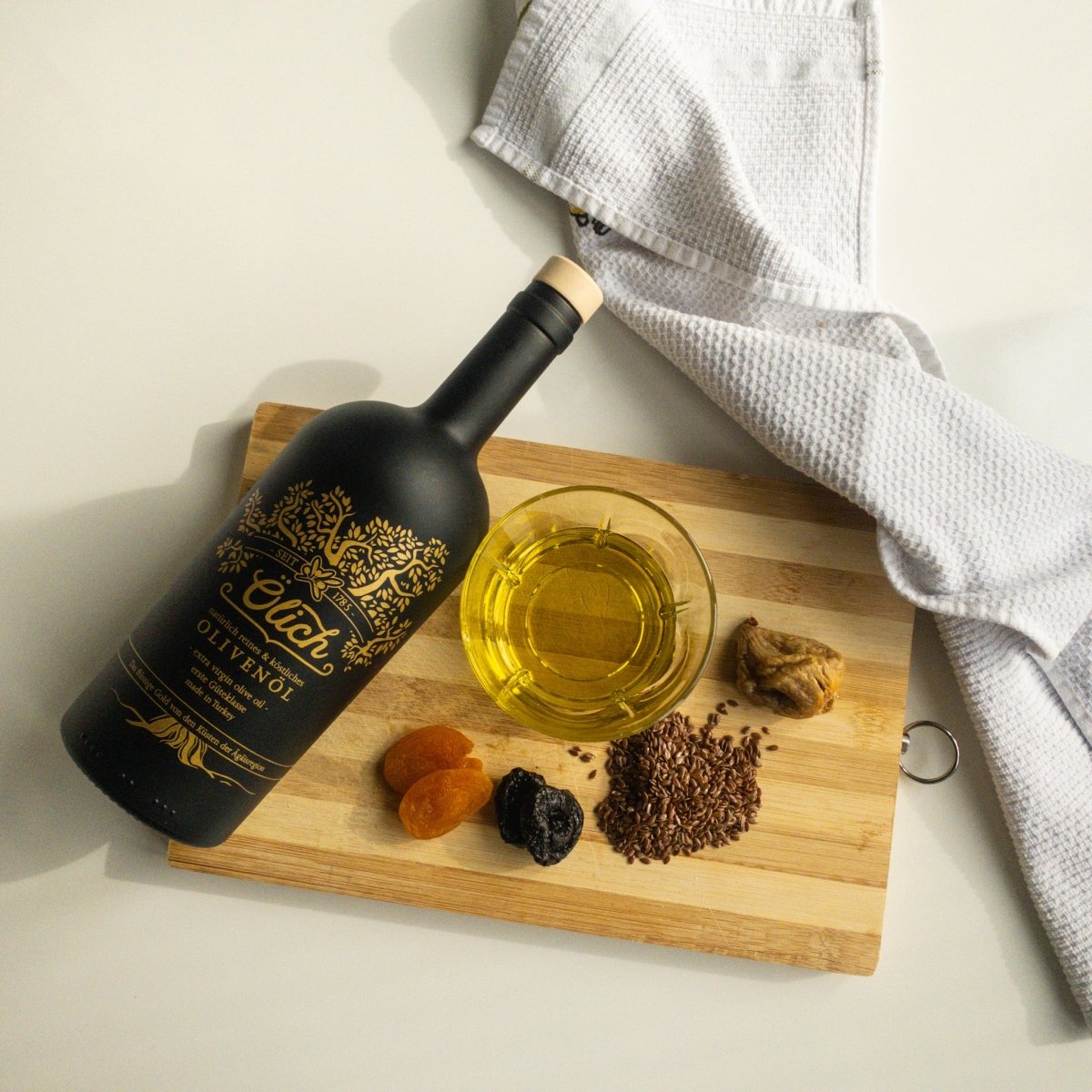Ingredients 1 dried fig 2 dried apricots 2 Plums 1 Tsp water 1 Tbsp ground flax seeds 1 Tablespoon of Ölich olive oil