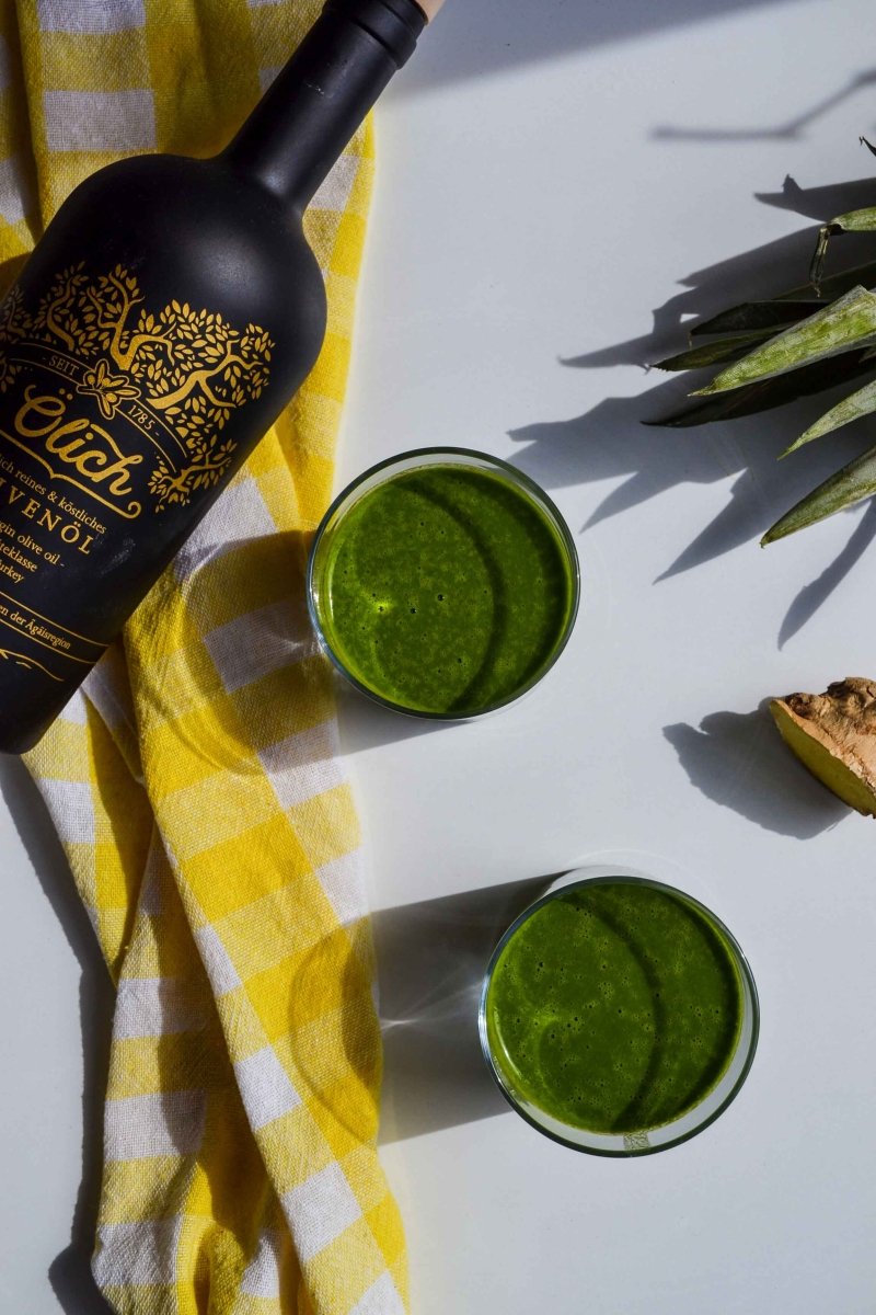 This olive oil super smoothie is perfect for promoting health. Ingredients 1x 2cm diced piece of fresh ginger 1x Handful of spinach 1x Handful of kale 5-6 small pieces of pineapple 20ml Ölich Olive...